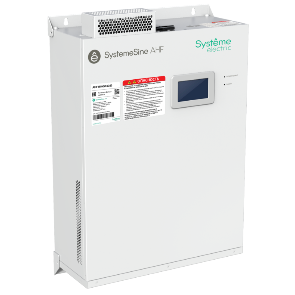 Активный фильтр гармоник торговой марки Systeme Electric серии SystemeSine типа AHF, номинальный ток 100А, номинальное напряжение 400В, степень защиты IP20, навесной модуль с встроенным 4,3 дюймовым ЖК дисплеем, ЭМС фильтром и портом RS-422