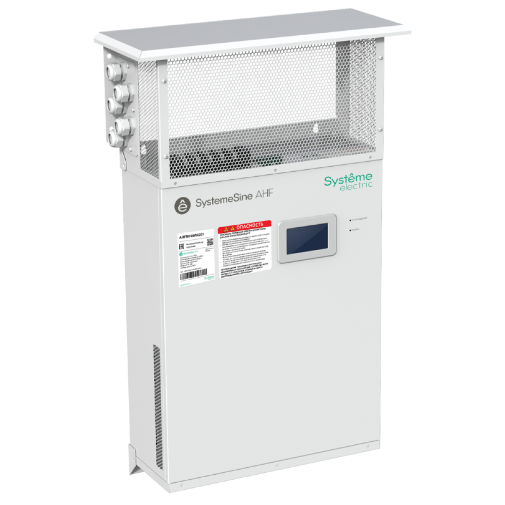 Активный фильтр гармоник торговой марки Systeme Electric серии SystemeSine типа AHF, номинальный ток 100А, номинальное напряжение 400В, степень защиты IP31, навесной модуль с встроенным 4,3 дюймовым ЖК дисплеем, ЭМС фильтром и портом RS-422