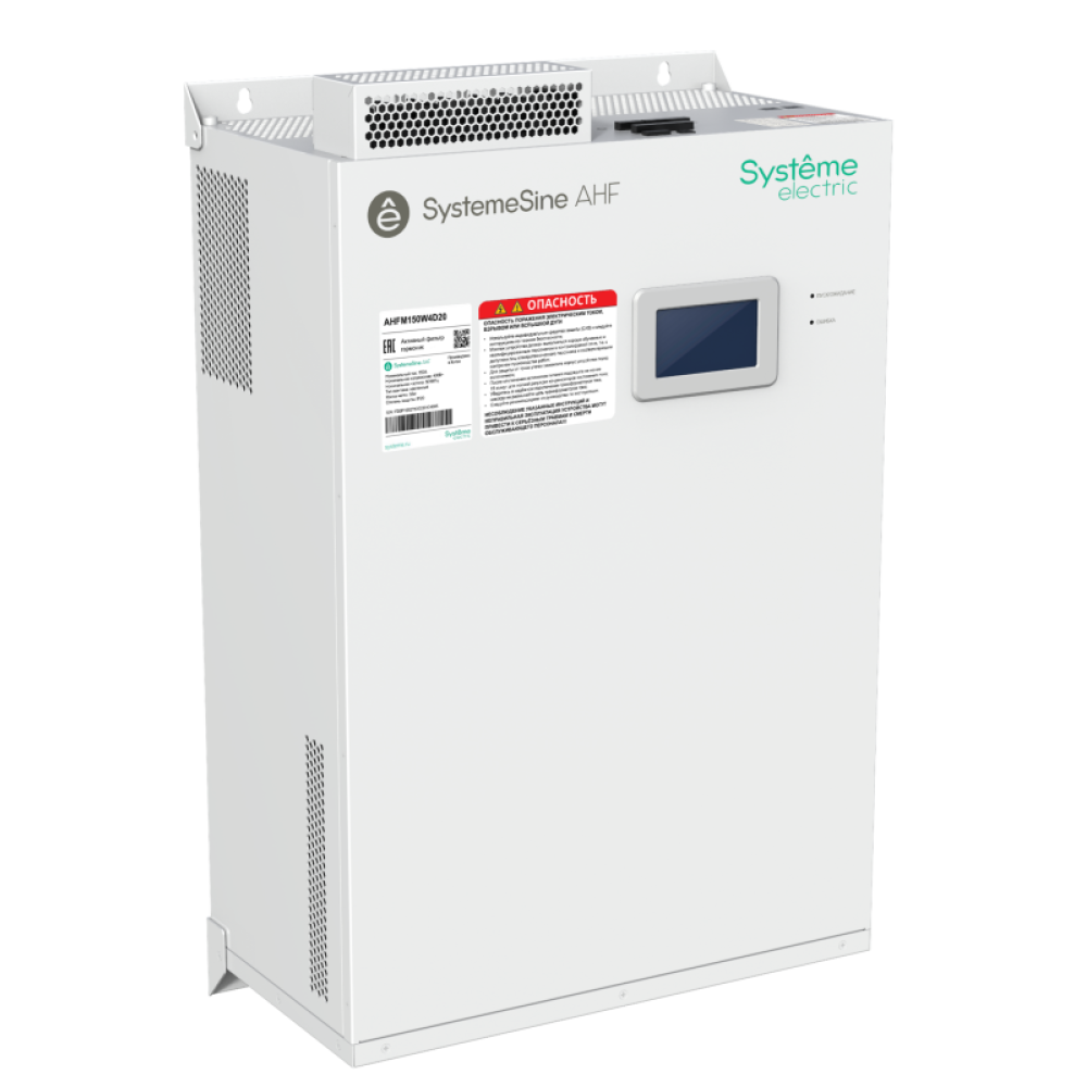 Активный фильтр гармоник торговой марки Systeme Electric серии SystemeSine типа AHF, номинальный ток 150А, номинальное напряжение 400В, степень защиты IP20, навесной модуль с встроенным 4,3 дюймовым ЖК дисплеем, ЭМС фильтром и портом RS-422
