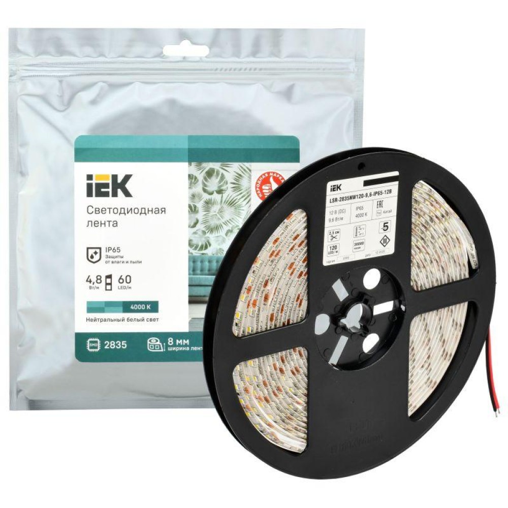 Лента светодиодная LSR-2835NW120-9.6-4000К IP65-12В (уп.5м) IEK LSR1-0-120-65-3-05