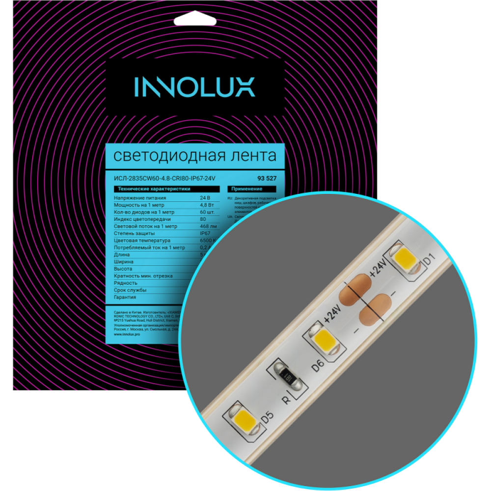Технические характеристики Лента светодиодная 93 527 СДЛ-2835CW60-4.8-CRI80-IP67-24V (уп.5м) INNOLUX 93527