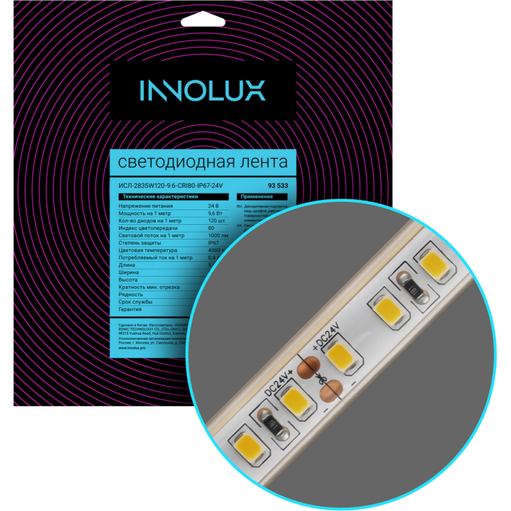 Технические характеристики Лента светодиодная 93 533 СДЛ-2835W120-9.6-CRI80-IP67-24V (уп.5м) INNOLUX 93533
