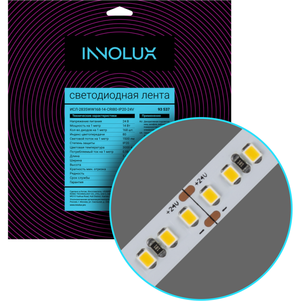 Технические характеристики Лента светодиодная 93 537 СДЛ-2835WW168-14-CRI80-IP20-24V (уп.5м) INNOLUX 93537