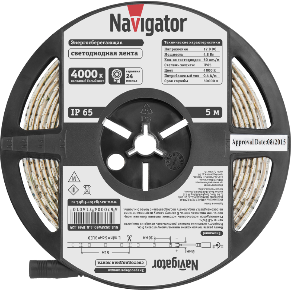 Технические характеристики Лента светодиодная 71 401 NLS-3528W60-4.8 IP65 12B R5 4.8Вт/м (уп.5м) Navigator 71401