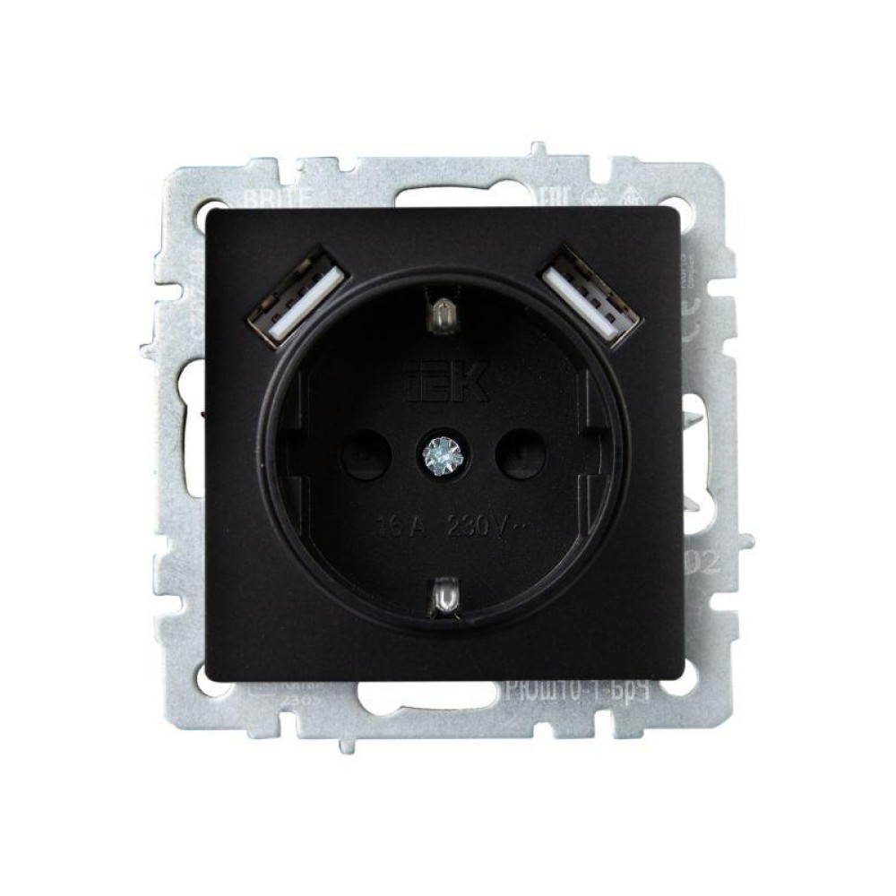 Розетка BRITE РЮш10-1-БрЧ 16А с USB A+A 2.1А с заземл. защ. шторки механизм черн. IEK BR-R14-16-U21-