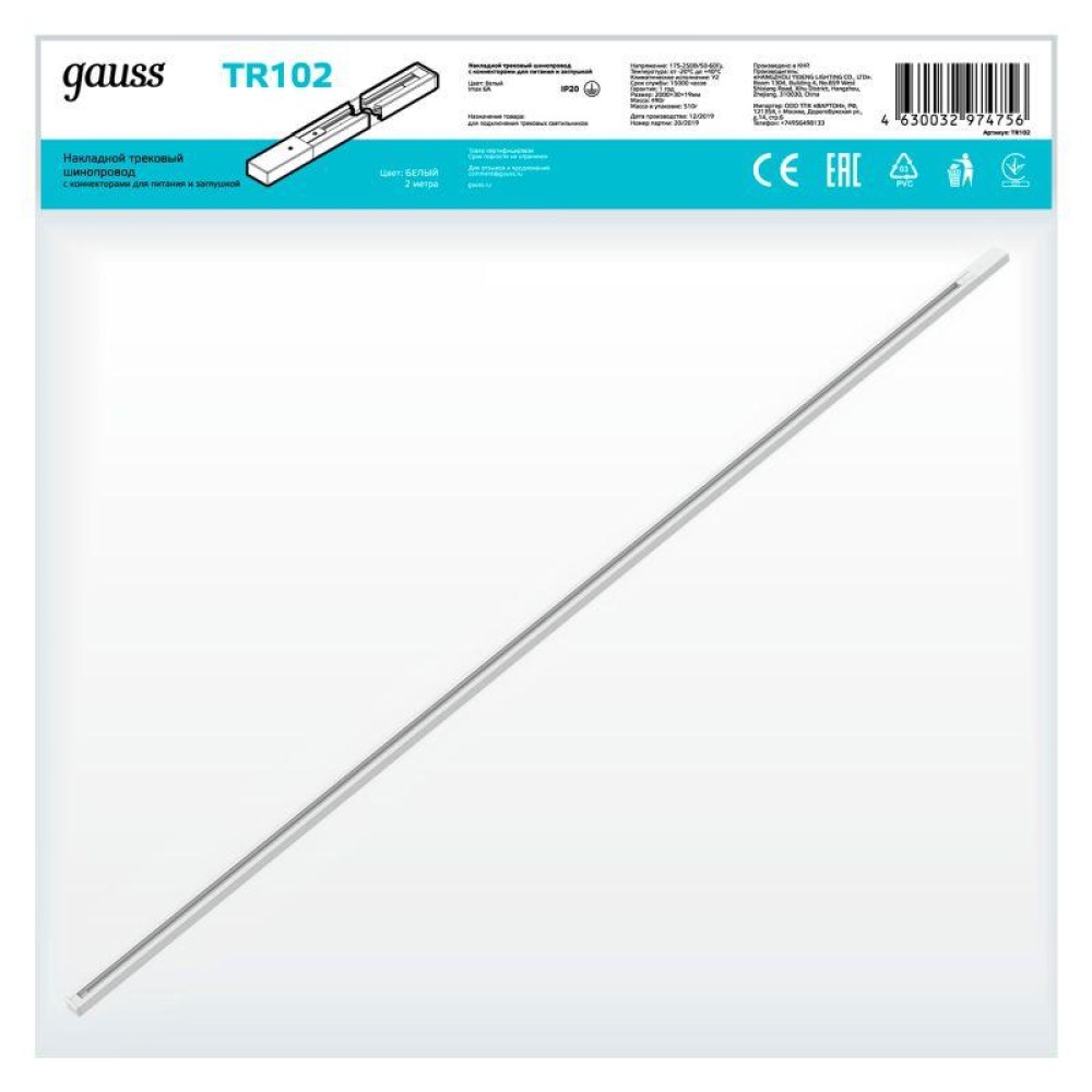 Технические характеристики Шинопровод однофазный L2000 Track накладной с адаптером питания и заглушкой бел. GAUSS TR102