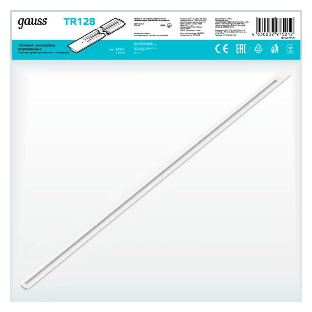 Технические характеристики Шинопровод однофазный L2000 Track встраив. с адаптером питания и заглушкой бел. GAUSS TR128