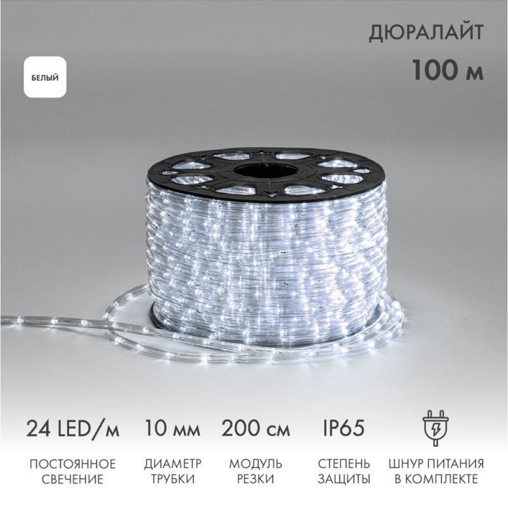 Шнур светодиодный Дюралайт фиксинг 2Вт 10мм 24LED/м бел. (уп.100м) Neon-Night 121-125-3