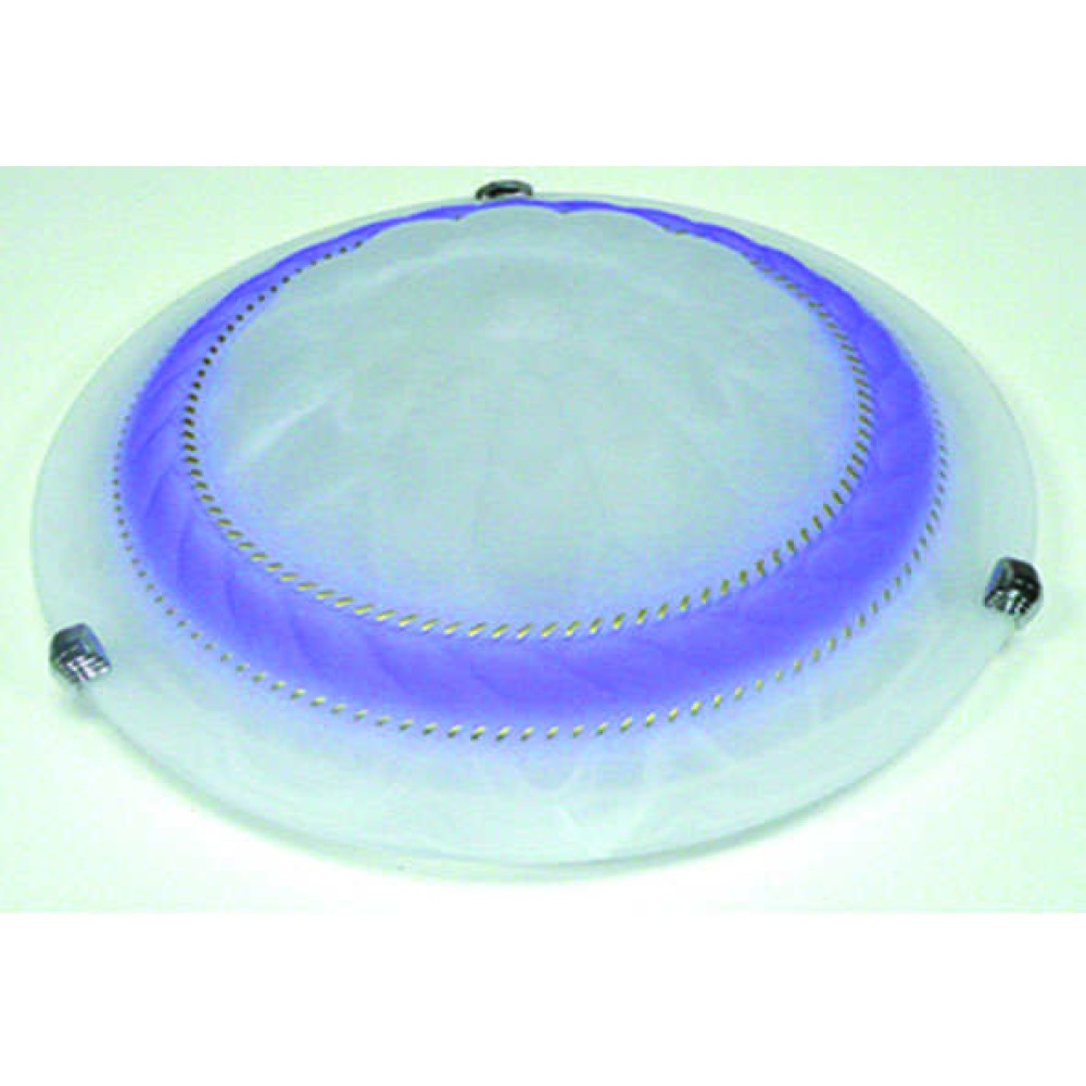 Алюминиевое основание окрашено белой краской. Металлических держатели хромированы. Патрон керамический. Плафон изготовлен из плотного алебастрового стекла. Добавление алебастровых красителей придает ему легкий размытый оттенок голубого цвета.