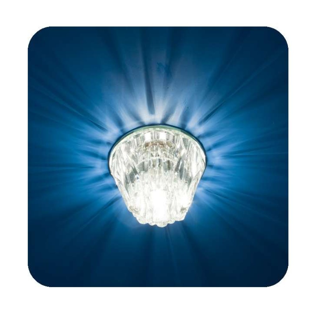 Основание круглое, из металла, цвета "металлик". Диаметр 85 мм, диаметр монтажного отверстия 60 мм. Плафон стеклянный, сложной геометрической формы, декорирован под хрустальный.