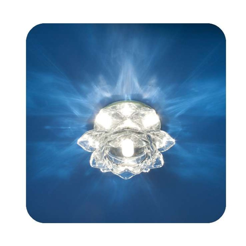 Основание круглое, из металла, блестящее, зеркальное. Диаметр 100 мм, диаметр монтажного отверстия 60 мм. Плафон стеклянный, сложной формы, в виде цветка кувшинки, декорирован под хрустальный.