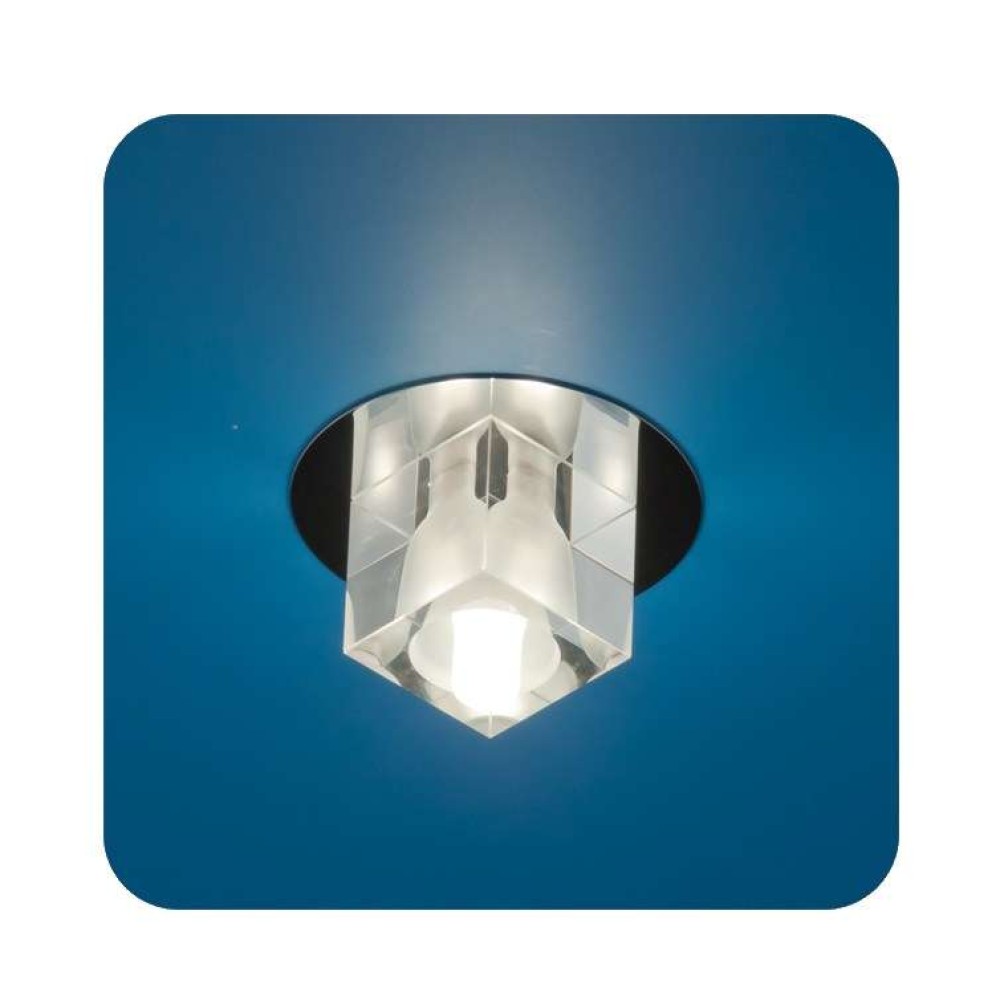 Основание круглое, из металла, цвета металлик. Диаметр 80 мм, диаметр монтажного отверстия 60 мм. Плафон стеклянный, кубической формы, декорирован под хрустальный.