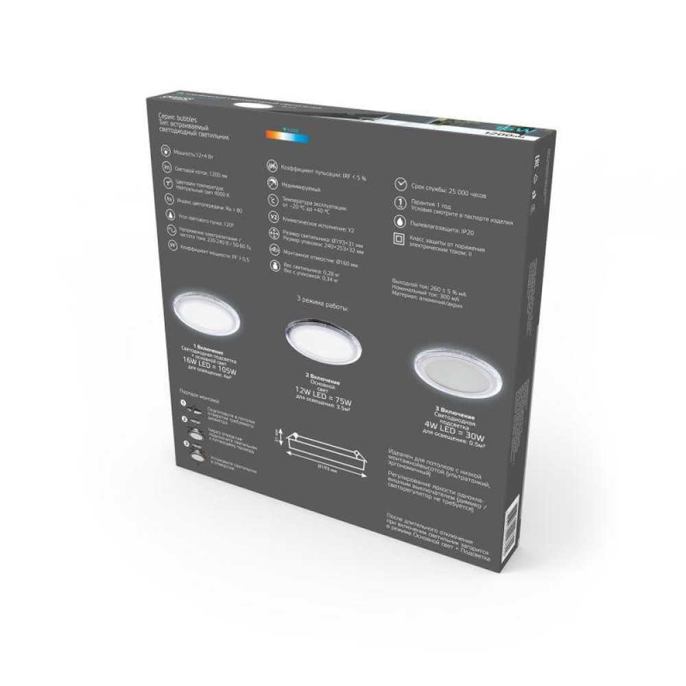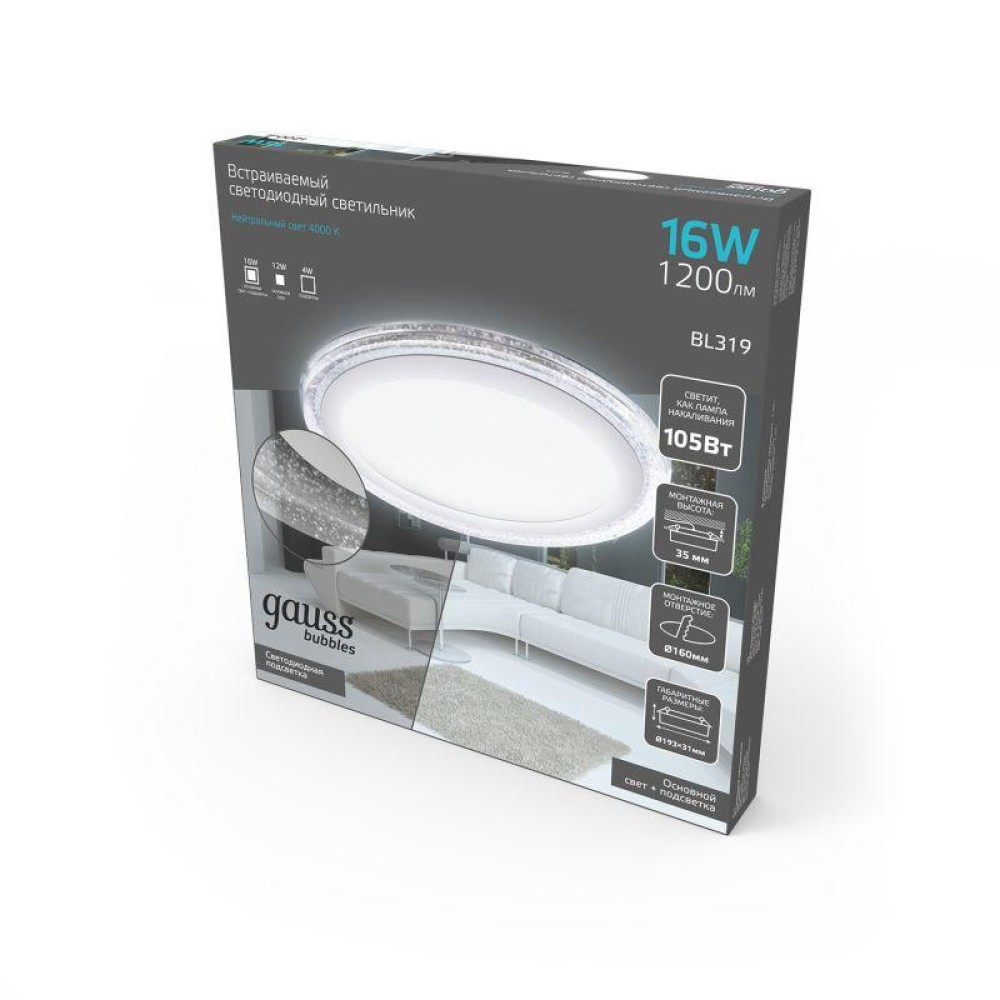 Технические характеристики Светильник светодиодный Bubbles 12+4Вт 4000К IP20 1200лм 220-240В ДВО круг бел. GAUSS BL319