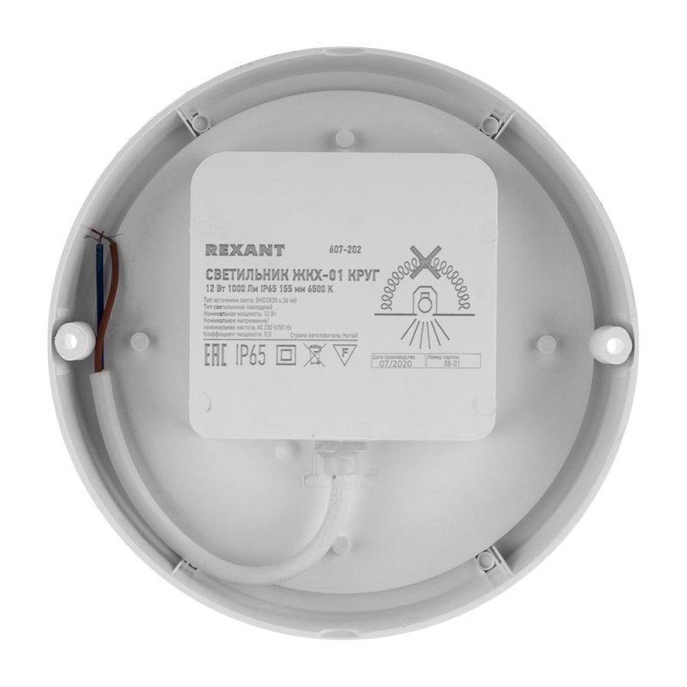 Технические характеристики Светильник светодиодный ЖКХ-01 12Вт 6500К IP65 1000лм 155мм пылевлагозащ. круг Rexant 607-202