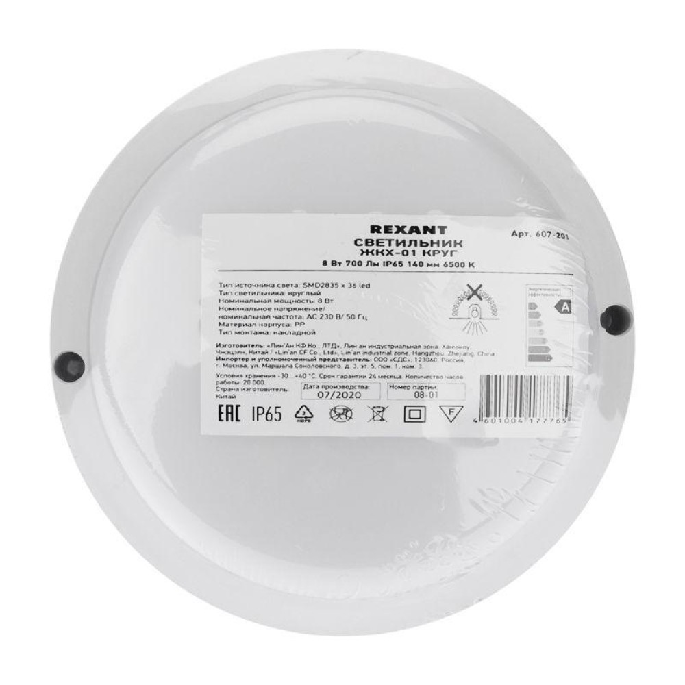 Технические характеристики Светильник светодиодный ЖКХ-01 8Вт 6500К IP65 700лм 140мм пылевлагозащ. круг Rexant 607-201